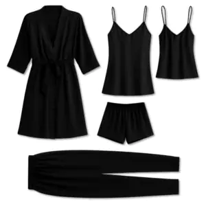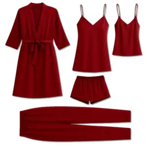 5-Piece Satin Sleepwear Set for Women, Luxury Nightwear Collection with Robe, Camisole, Shorts, Pants & Slip Dress, Free Size 28–38, Available in Maroon, Black & Blue
