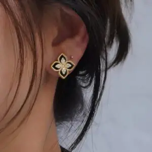 Black and Gold Floral Earrings Elegant Four-Petal Studs with Black Enamel, Cubic Zirconia & Super Gold-Tone A1 Detailing