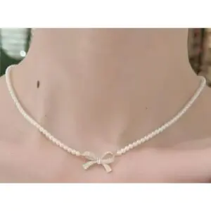 Bow Shape Pearl Pendant Necklace for Women super Elegant Bow Design with Sparkling Stones & Pearl Strand in 2 Silver & Golden