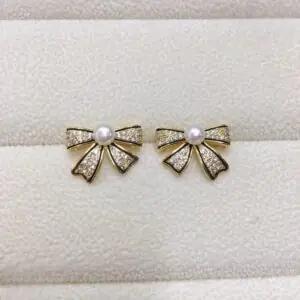 Bow Shape Zircon Pearl Earrings for Women Korean Style Jewelry with Sparkling Zircon & Classic Pearl in 2 colors Golden & Silver