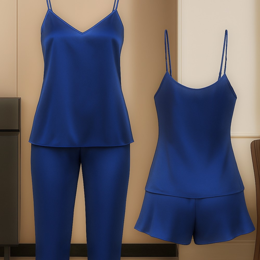 - Luxurious 3-piece satin set: camisole, pajama & shorts