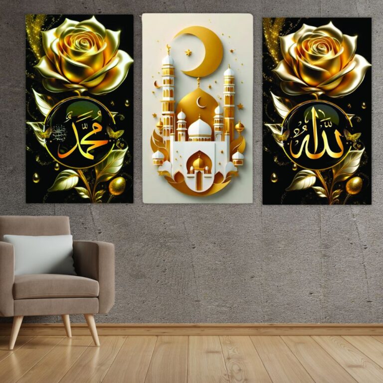 Set of 3 Islamic Calligraphy Wall Art Frames, Peel and Super Stick Wooden Canvas, High-Quality Digital Prints, No Drilling Required
